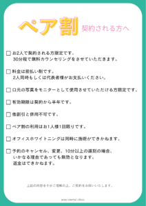 友達、親子、夫婦、カップル…など ペアであれば誰でも可能です💖 (条件あり、画像を確認お願いします) オフィスホワイトニング30,000→22,000 ホームホワイトニング50,000→44,000 成人式や卒業式などのイベントに向けてであれば早めに始めるのがオススメです!
